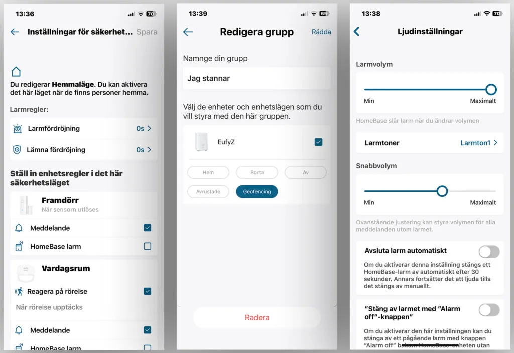 L’app Eufy Security offre più funzioni di quante ne servano realmente per un sistema di allarme così semplice. Questo perché è la stessa app utilizzata per l’intero ecosistema Eufy, che comprende anche videocamere e serrature smart in numerose varianti. Tuttavia, Eufy è riuscita a mantenere l’interfaccia intuitiva, nonostante la quantità di funzioni aggiuntive. Nella schermata principale compaiono due pulsanti: Resto a casa e Esco (in svedese “Jag stannar” e “Jag lämnar”).